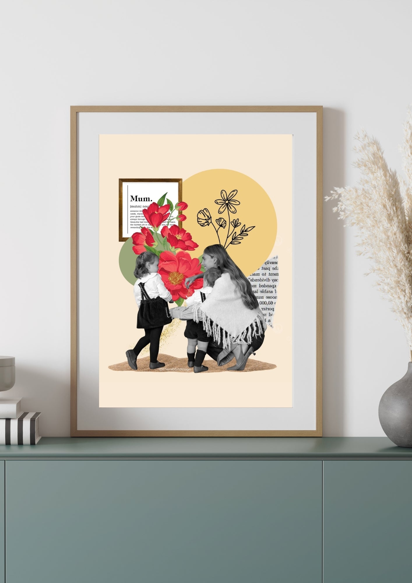 Un collage pensado para celebrar a todas las madres con un diseño lleno de personalidad. Repleto de elementos gráficos que evocan cariño y cuidado, este diseño especial es un detalle diferente y original.