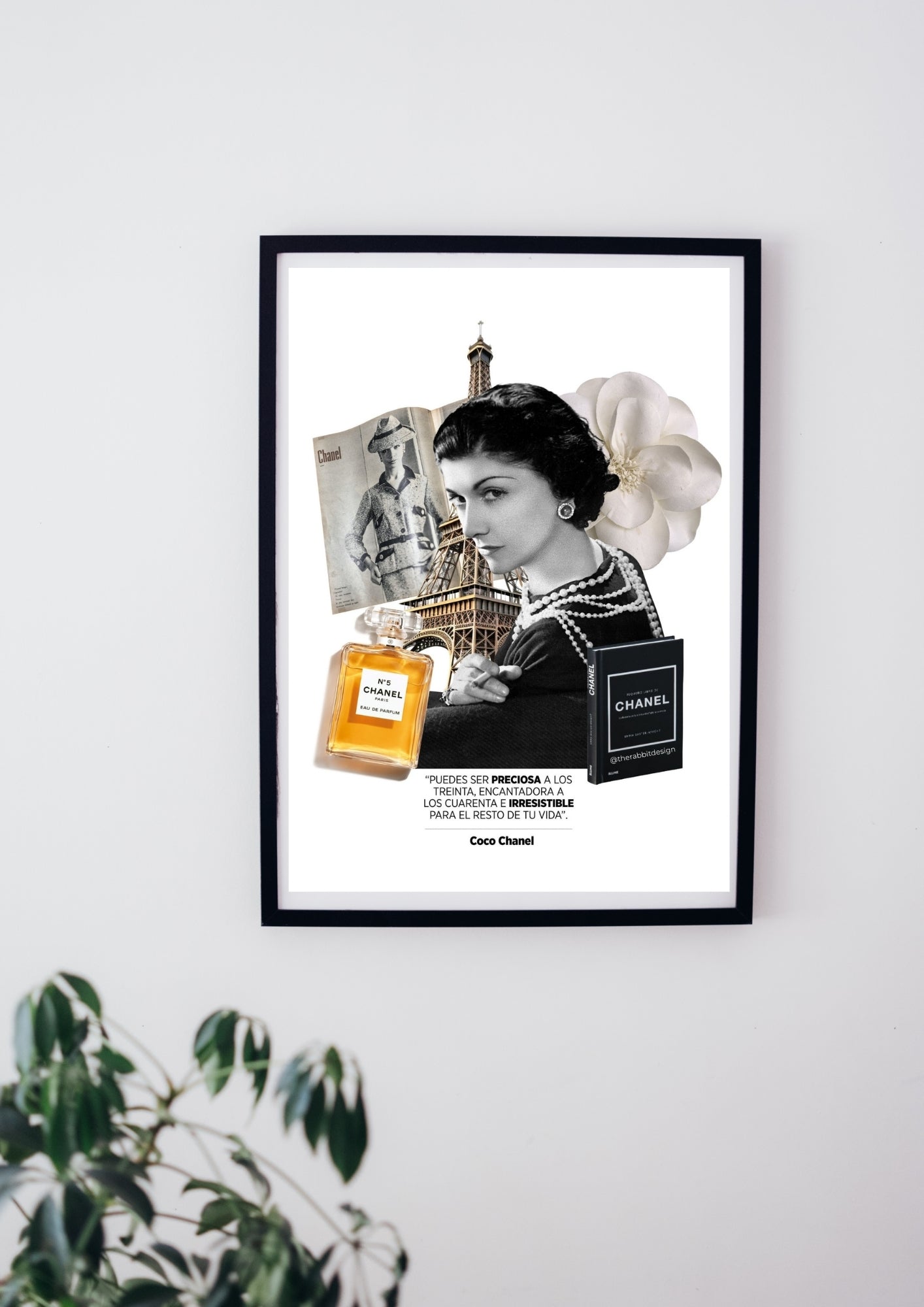 Un homenaje visual a París a través del estilo inconfundible de Coco Chanel. Este diseño mezcla iconos parisinos como la Torre Eiffel con referencias al mundo de la moda y el legado de Chanel, dando lugar a una composición elegante y atemporal.