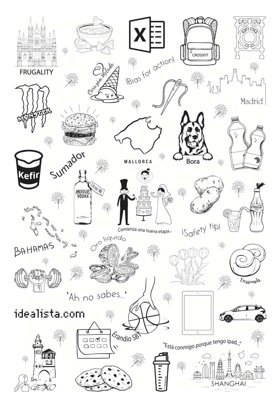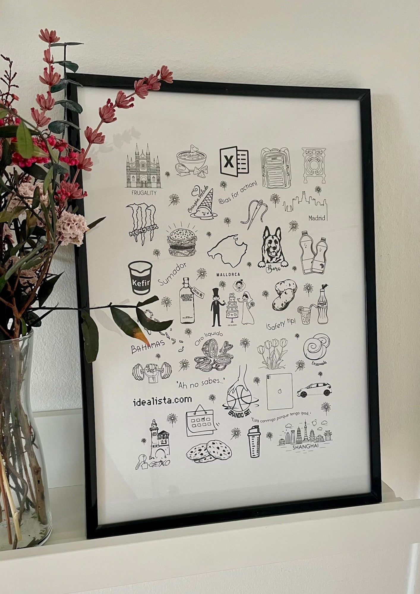 Un diseño único compuesto por pequeños dibujos personalizados que narran tu historia de manera visual y original. Cada ilustración de Galimatías es una representación única de momentos, lugares y objetos significativos. Desde tus viajes favoritos hasta esos detalles cotidianos que te hacen sonreír, cada pieza está diseñada para capturar la esencia de tu historia.