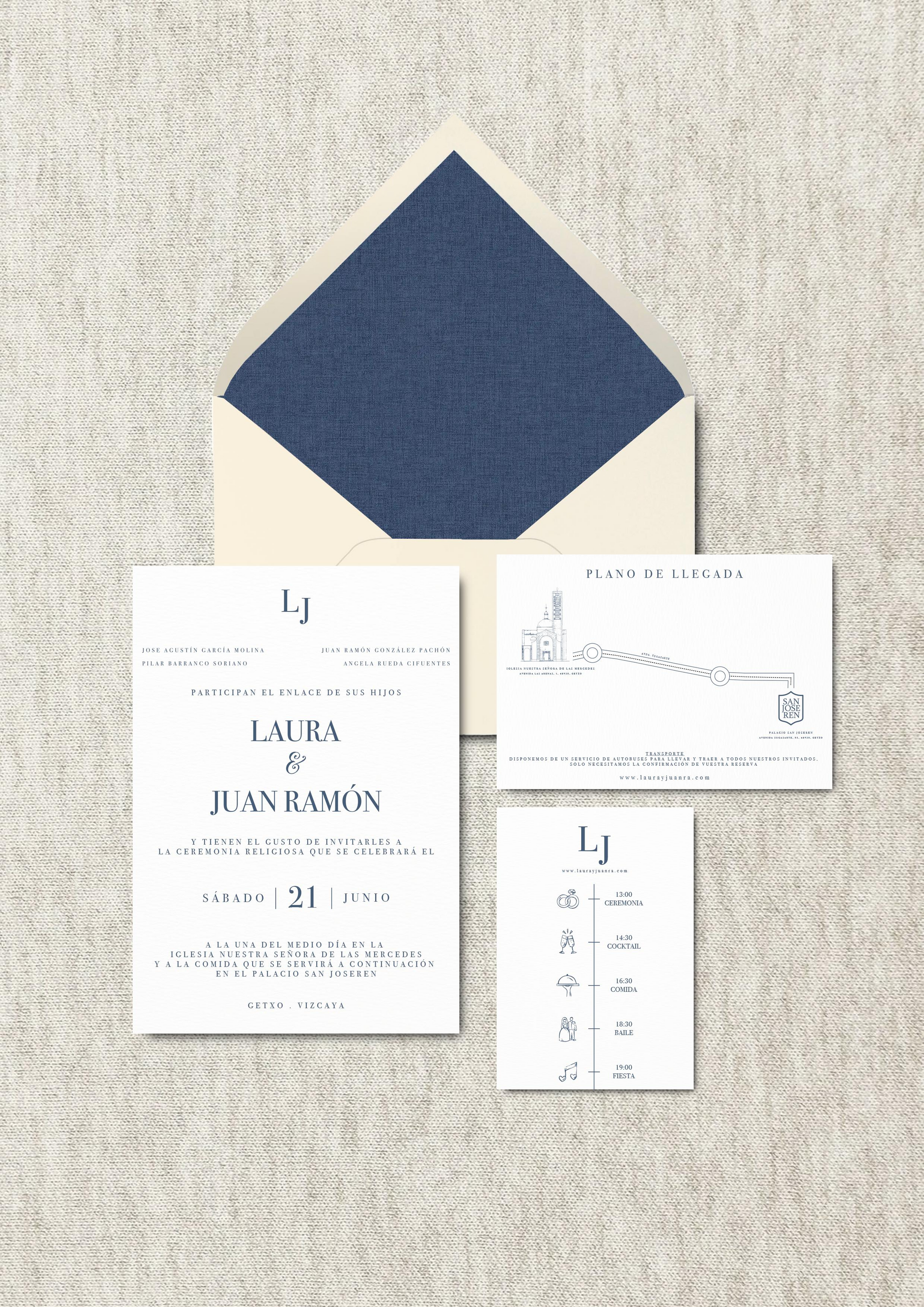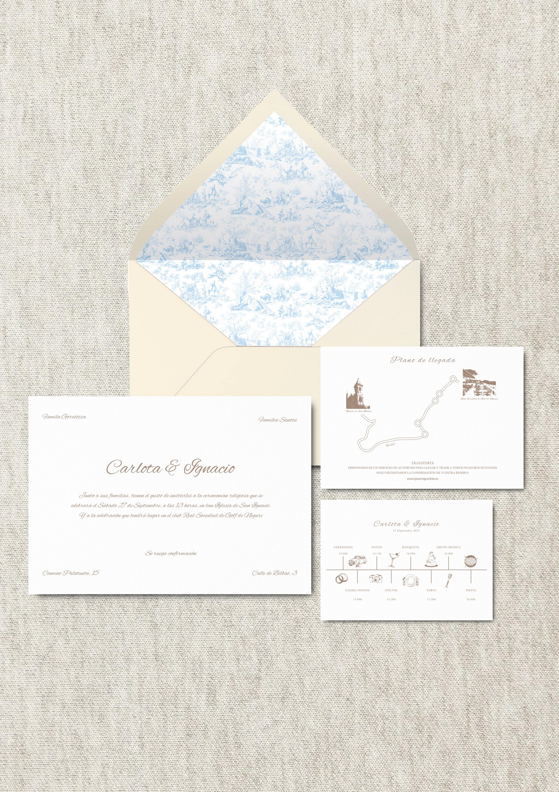 El precio incluye sobres lisos color crema forrados con diferentes diseños a elegir como el profundo azul marino, suaves rayas en tonos vino, verde, chocolate, gris claro o el delicado Toile en azul cyan. Cada diseño tiene su propio carácter, pero todos comparten un cuidado por los detalles y un equilibrio entre lo tradicional y lo actual, dejando una primera impresión inolvidable en tus invitados.