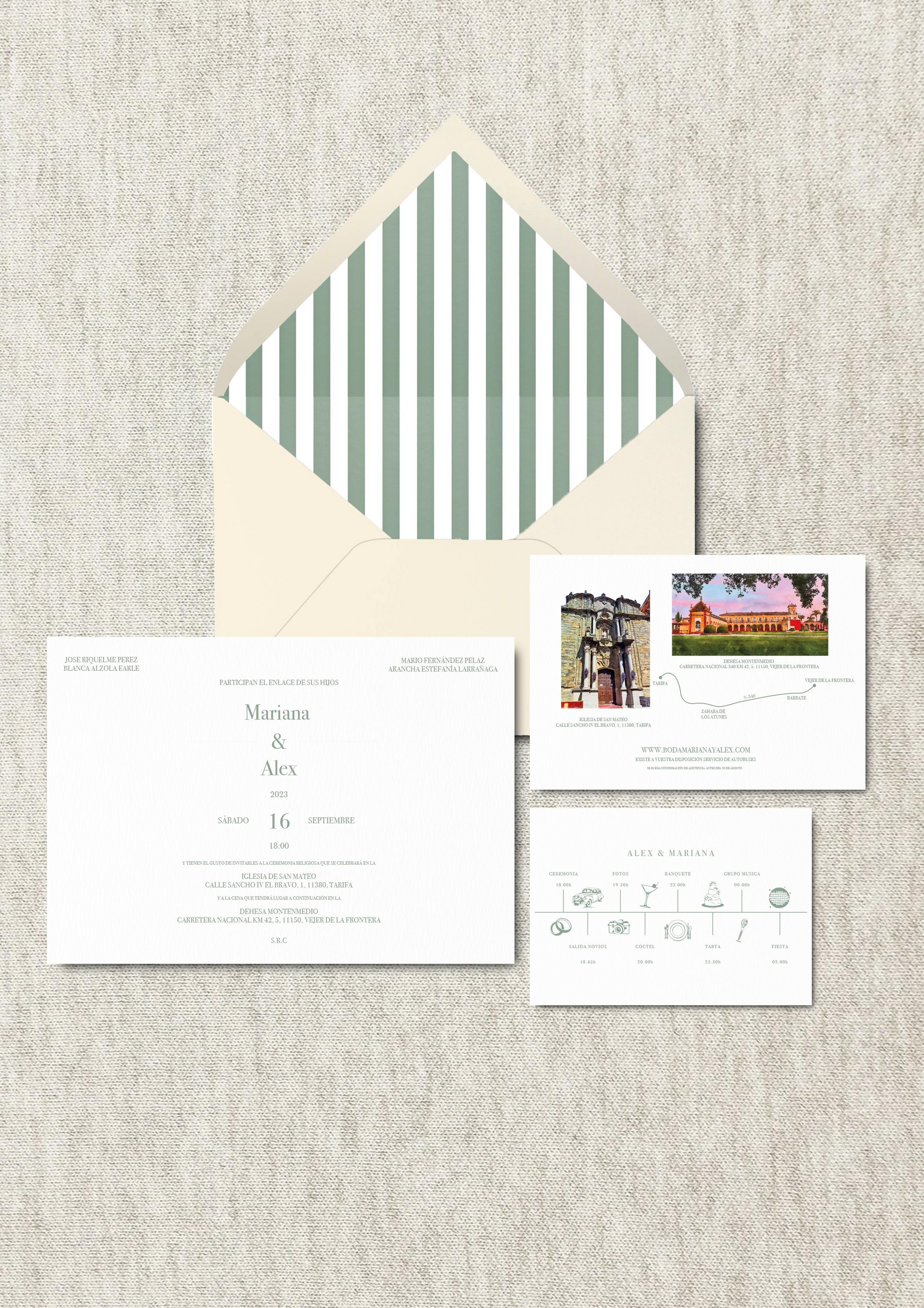 Puedes elegir el tipo de invitación que mejor se adapte a tu estilo: Tarjetón sencillo vertical tamaño A5, Tarjetón sencillo horizontal tamaño A5 o Tarjetón doble tamaño A4 (tipo díptico, con apertura). Cada uno ofrece la posibilidad de presentar vuestra información con texto personalizado, manteniendo siempre un diseño cuidado y a juego con la paleta de color del sobre.