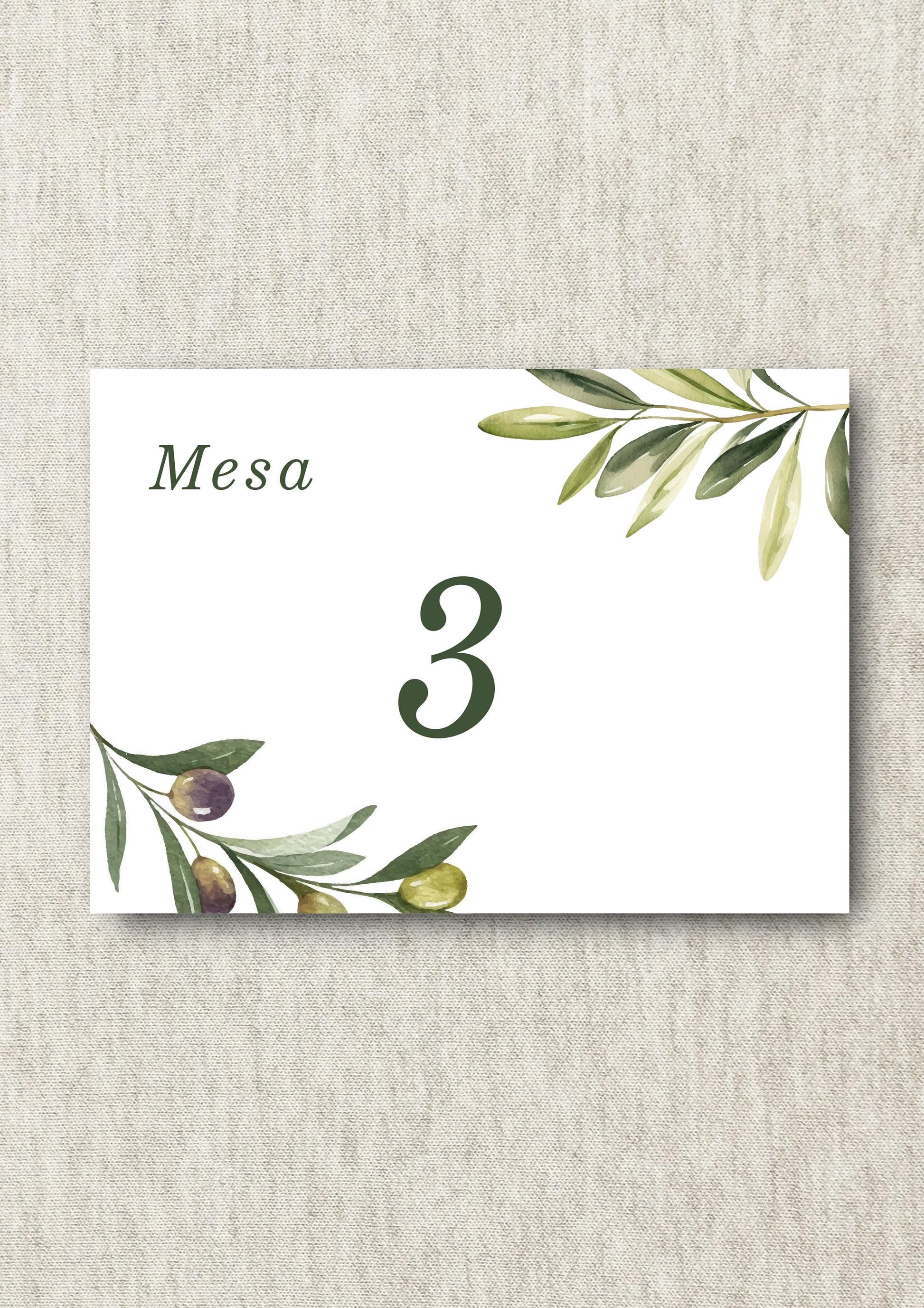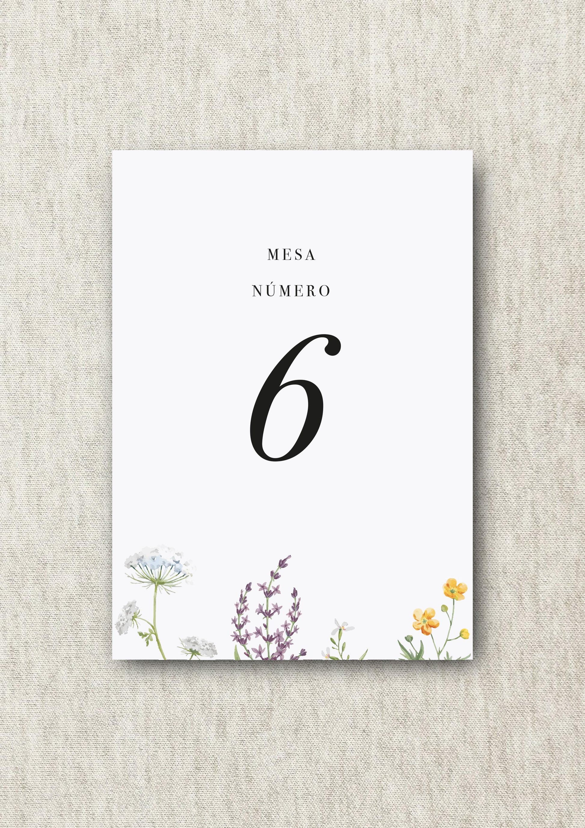 - Mesero (Número de mesa): tarjeta individual con el número o nombre de la mesa. Se coloca en el centro de cada mesa para que los invitados la localicen con rapidez una vez hayan consultado el seating plan.