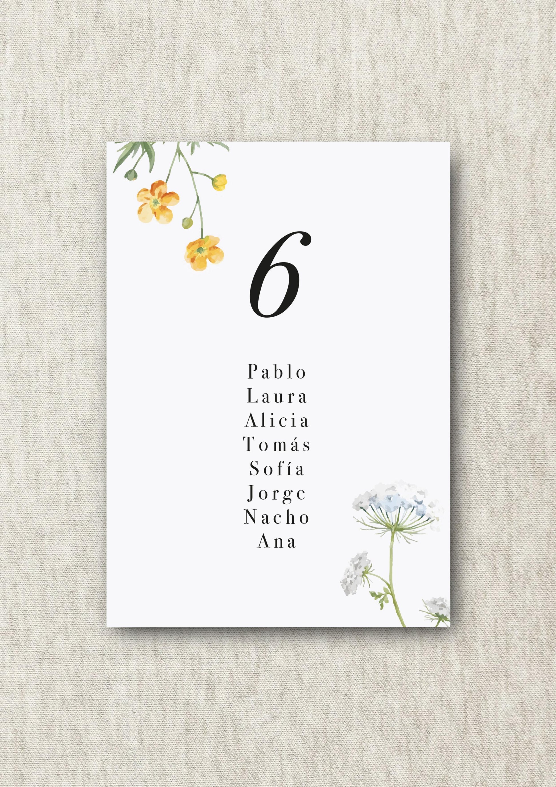 - Seating Plan: una tarjeta por cada mesa, donde incluimos el número o nombre de la mesa y la lista de invitados que se sentarán en ella. Estas tarjetas se colocan en la entrada de la sala para que cada persona pueda encontrar fácilmente su mesa asignada.